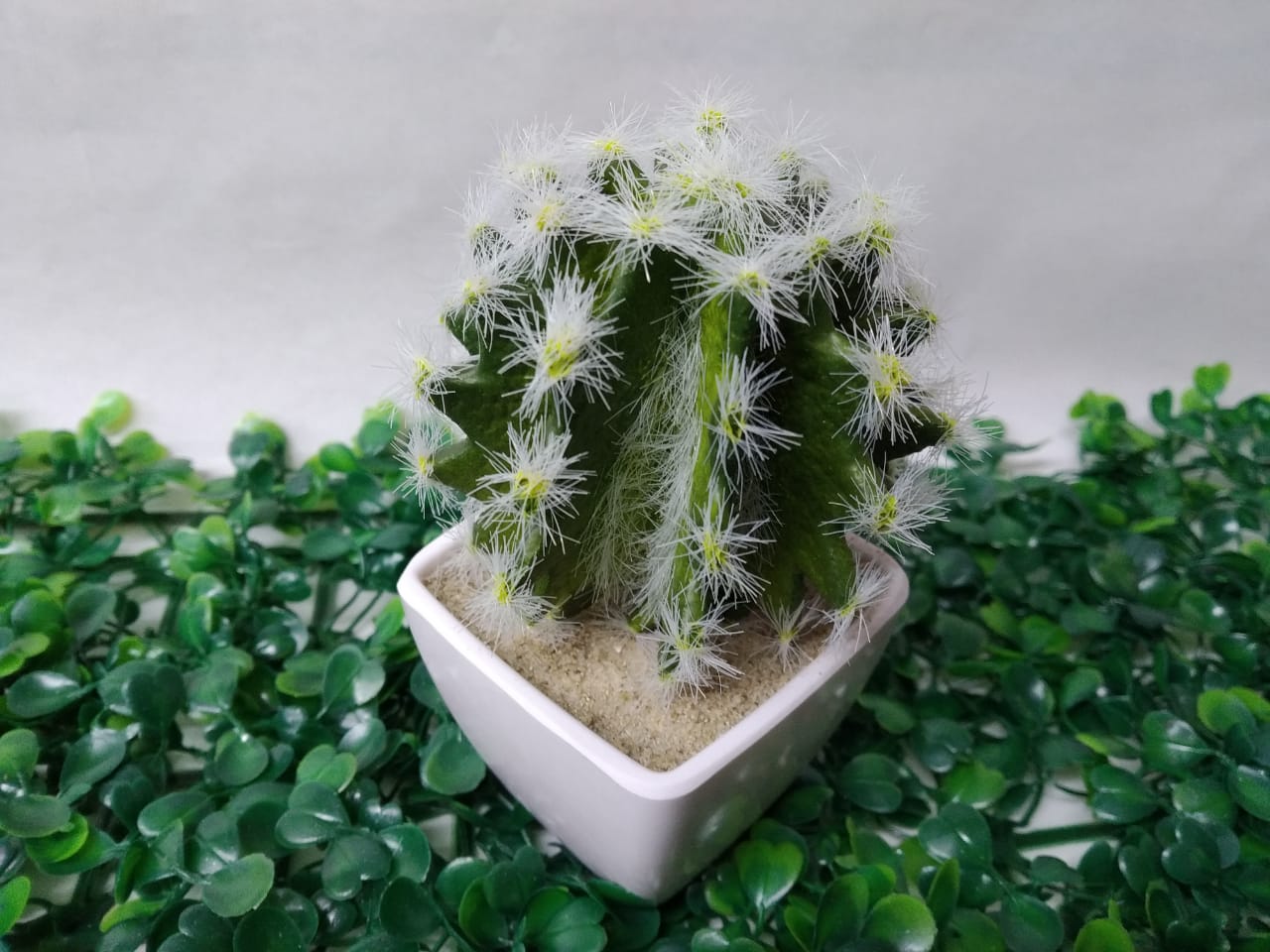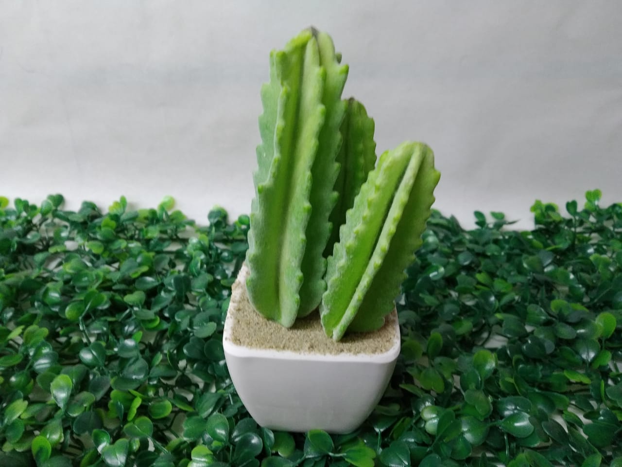 Maceta plástica con cactus artificial.