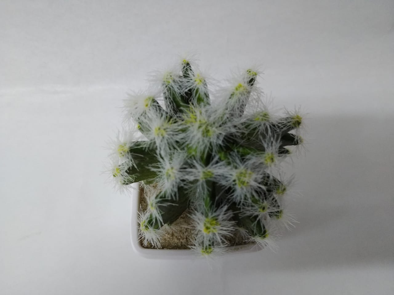 Maceta plástica con cactus artificial.