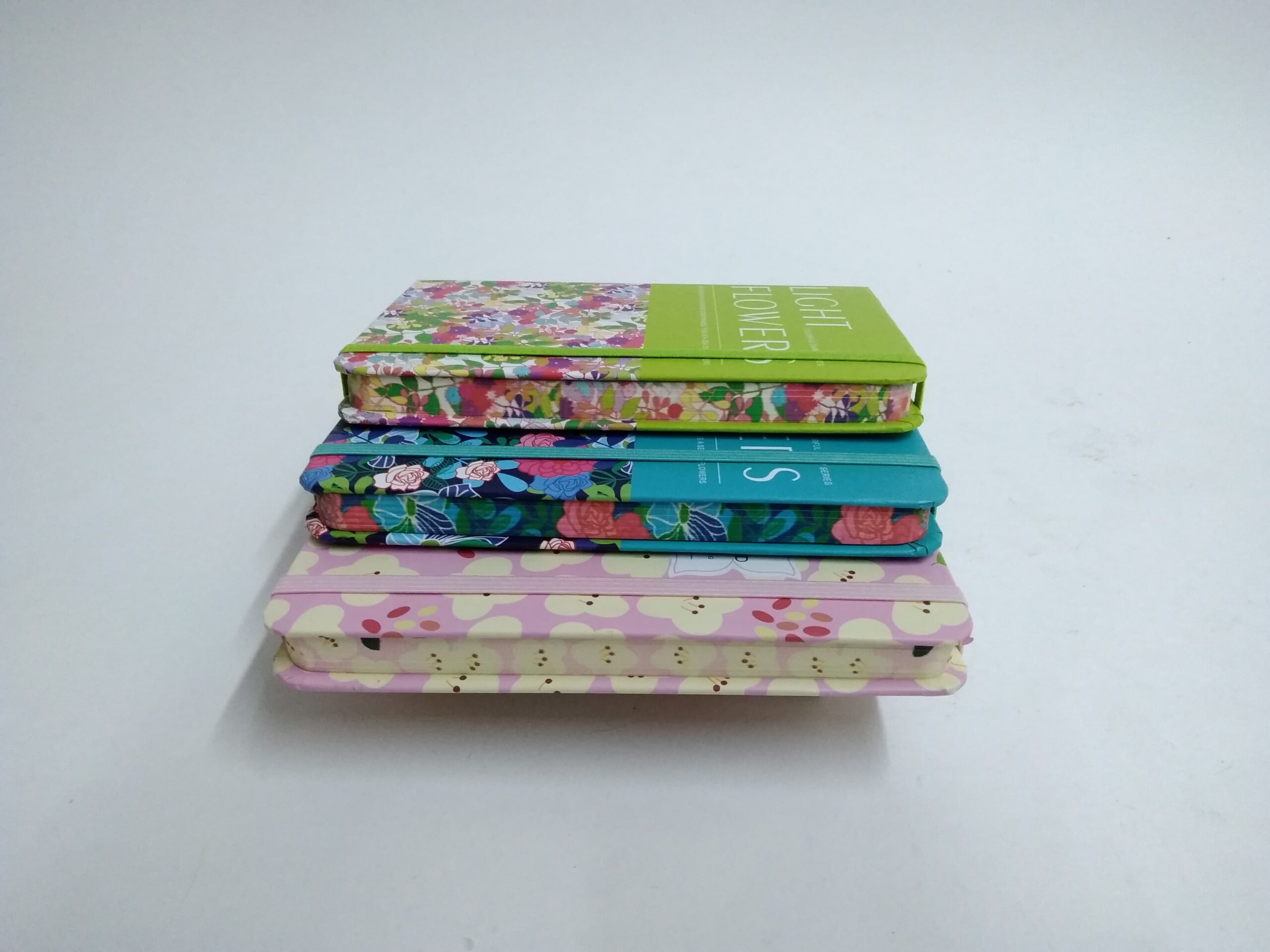 Libreta de tapa dura, hojas rayadas y cierre con banda elástica.