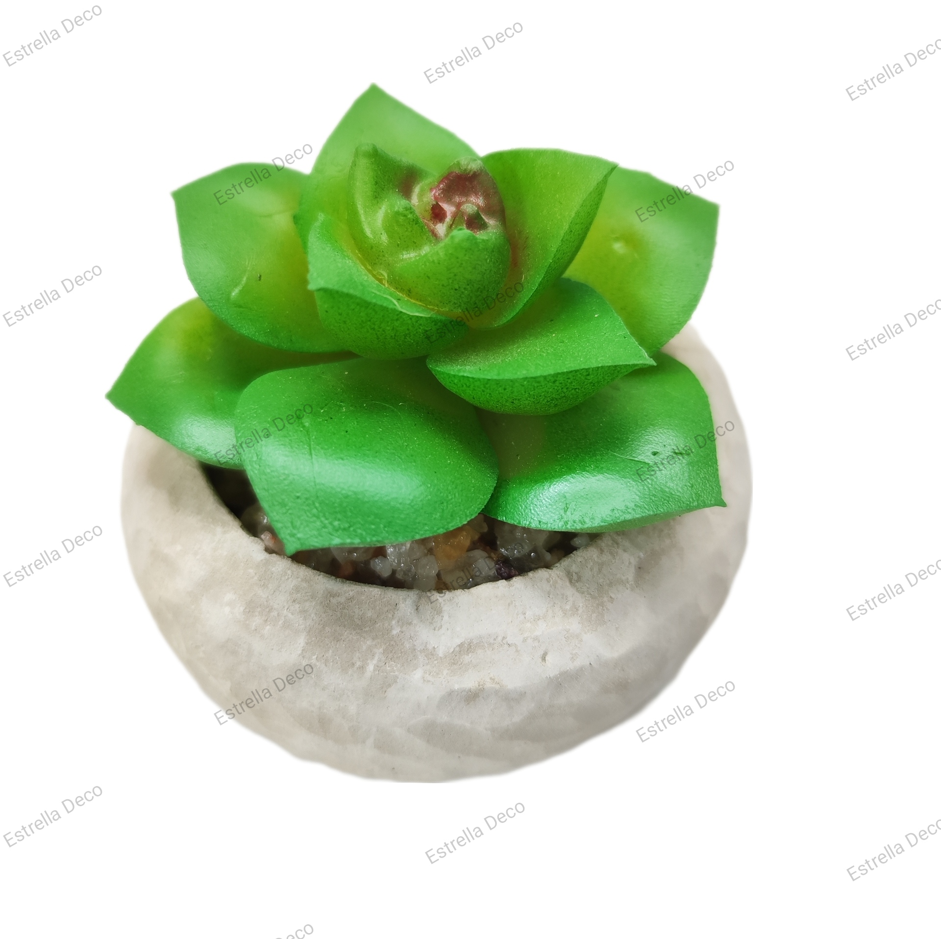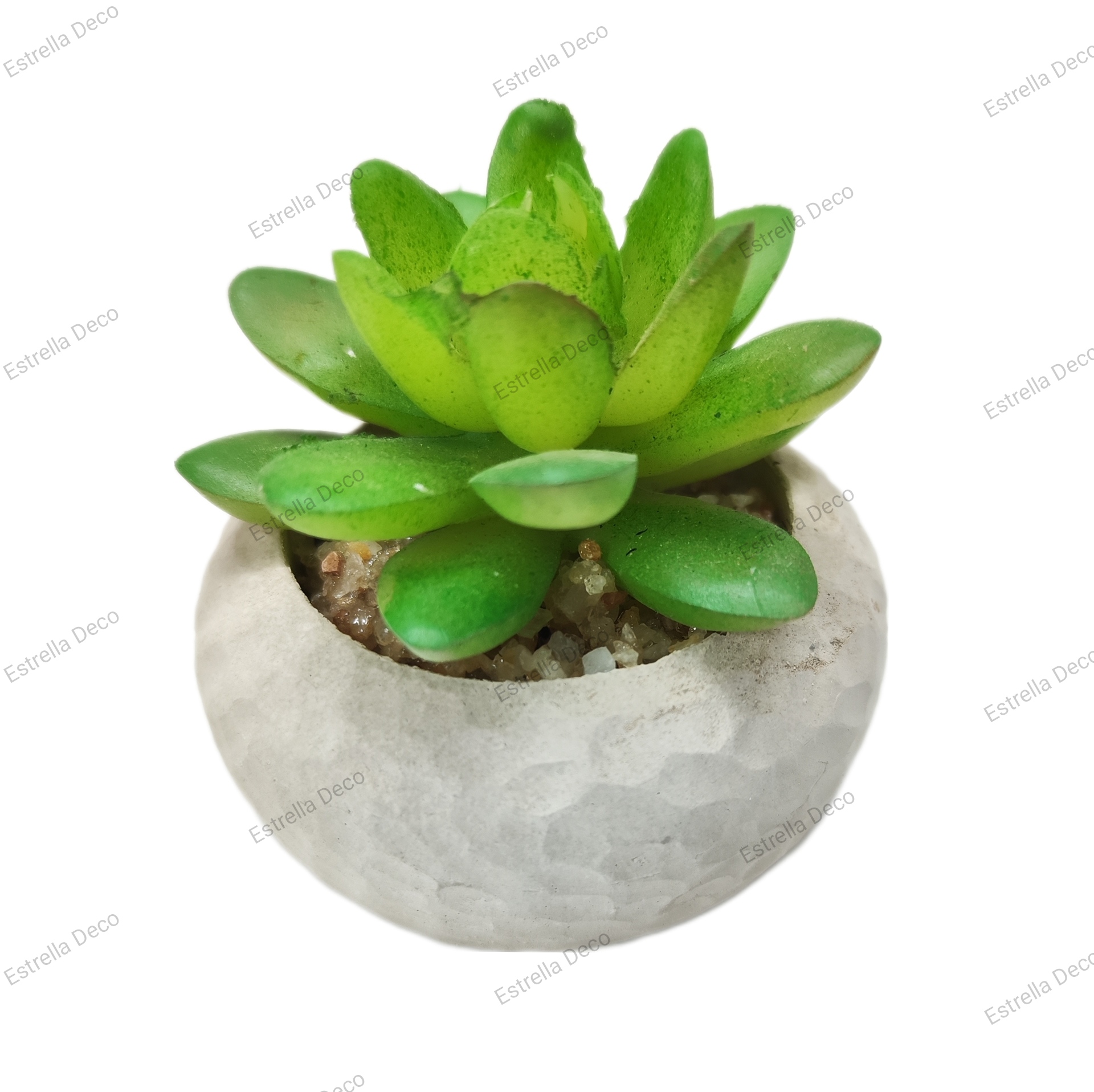 Maceta redonda, de cemento, con planta plástica.