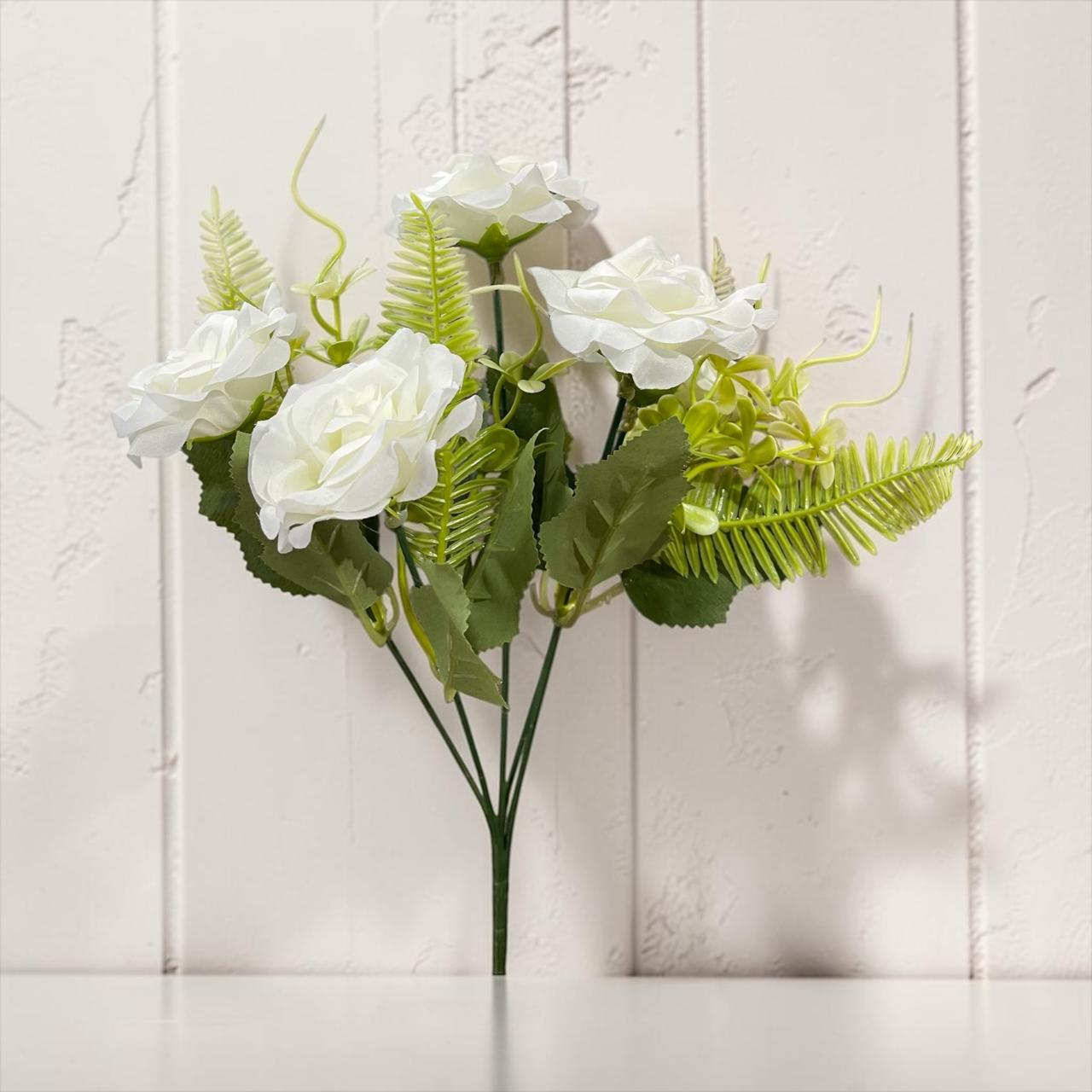 Elegancia y delicadeza en un solo producto. Este ramo de rosas artificiales con follaje verde es ideal para decorar cualquier ambiente con un estilo moderno, natural y sofisticado.