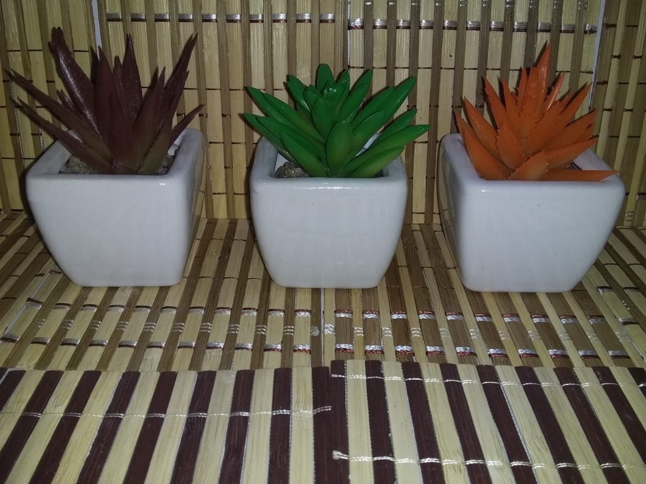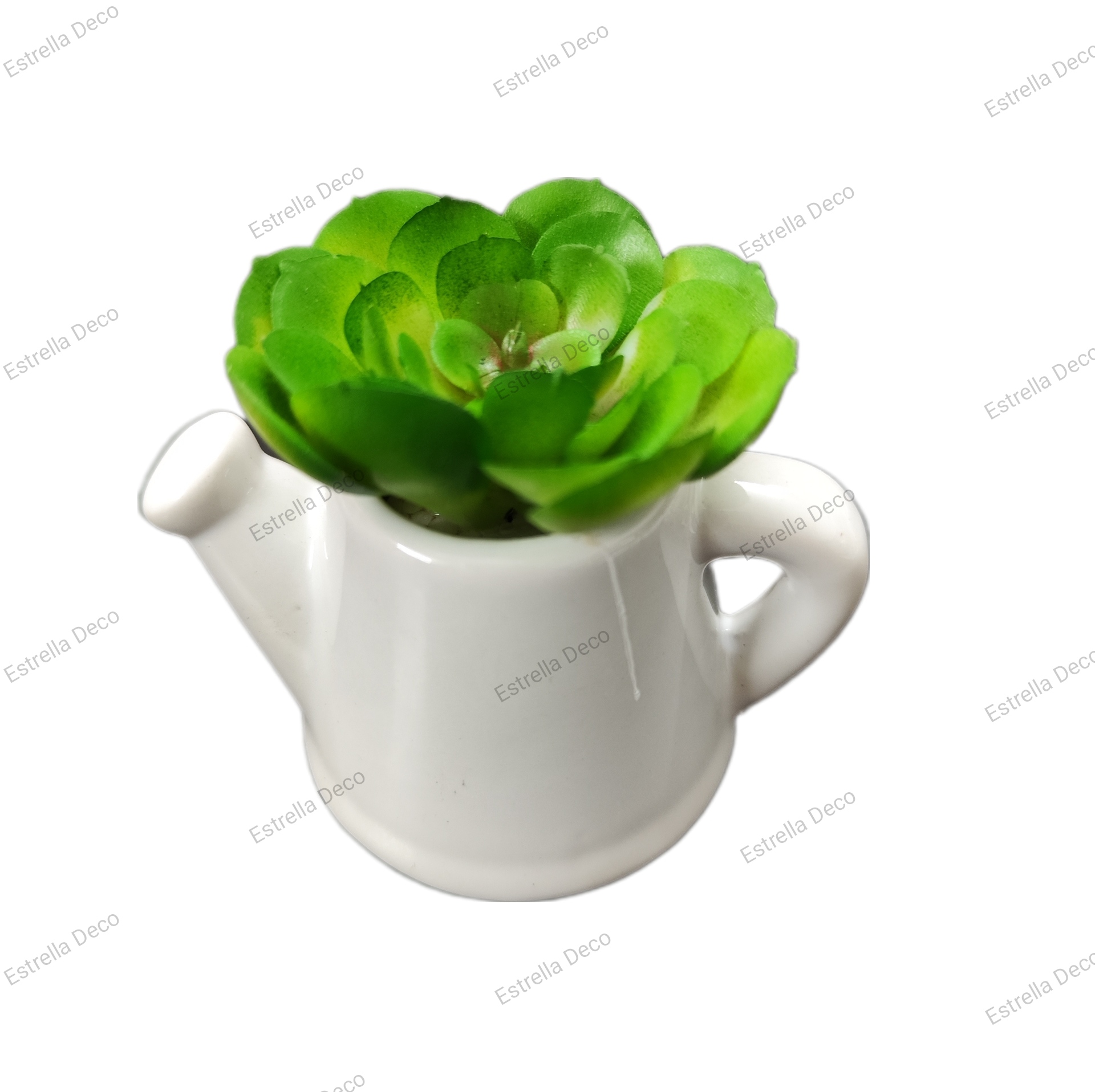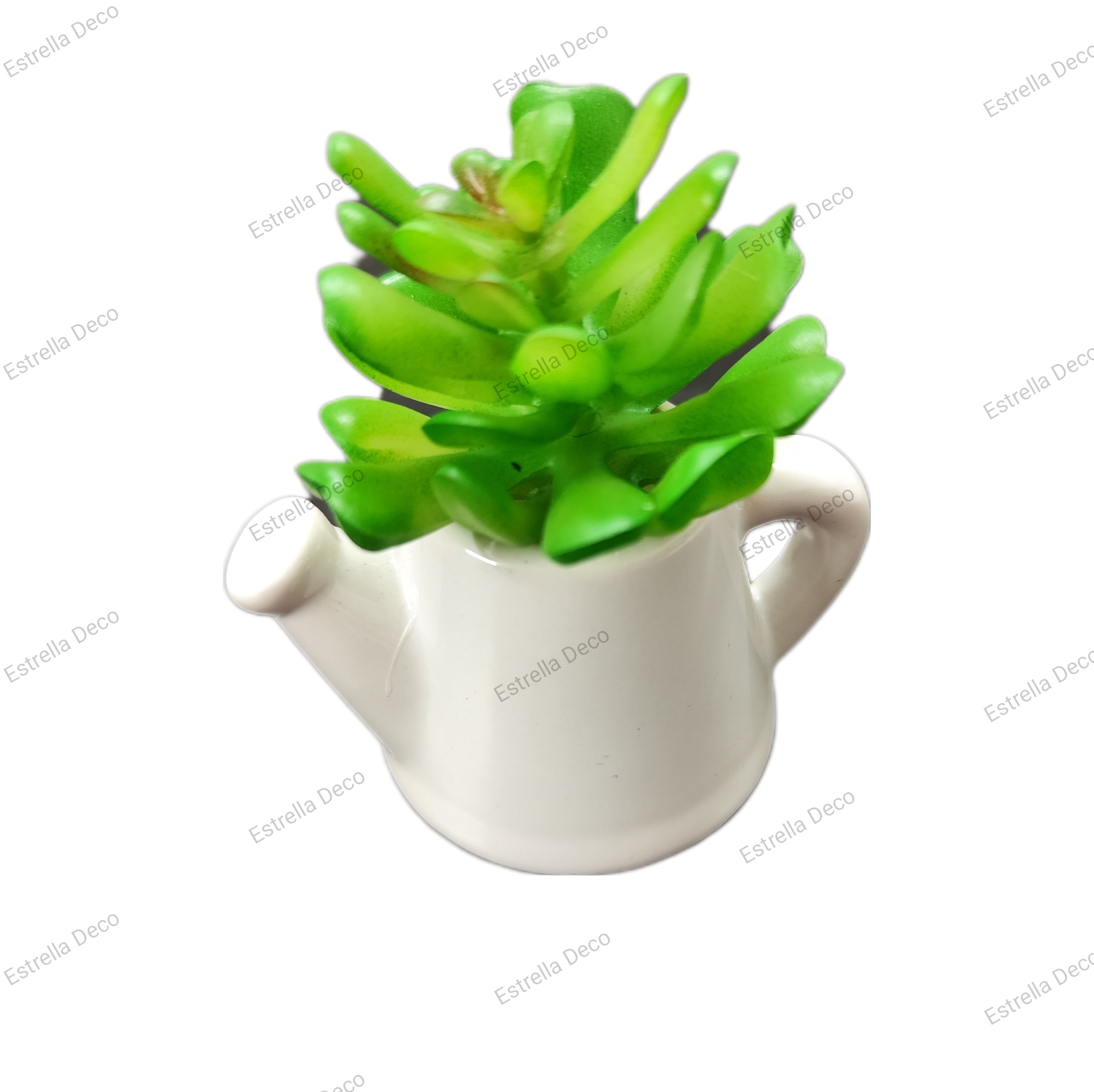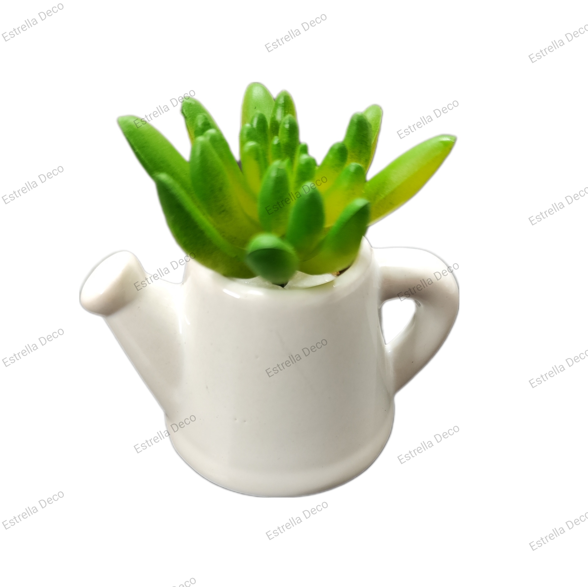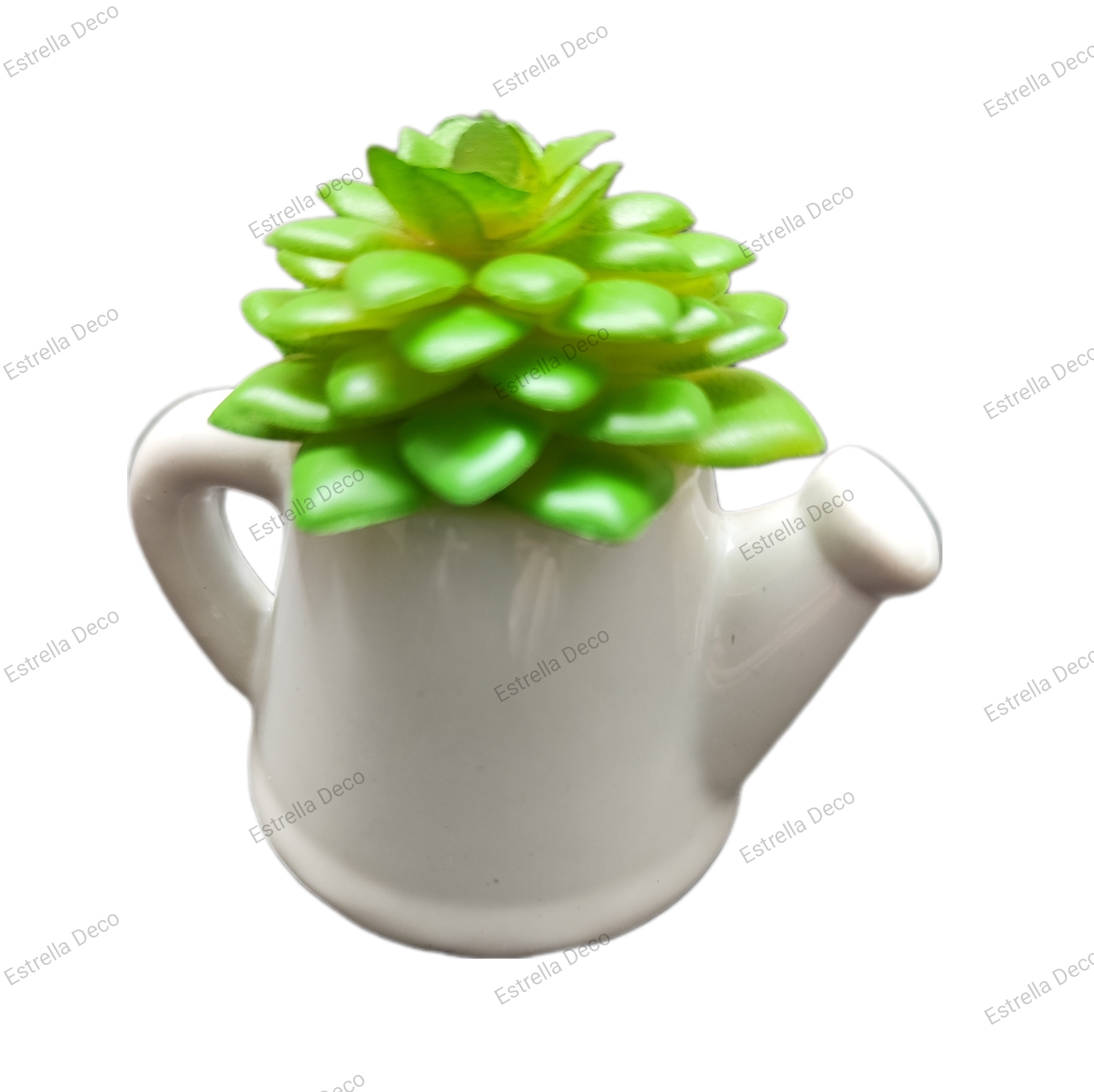 Regadera de cerámica esmaltada, con suculenta plástica.