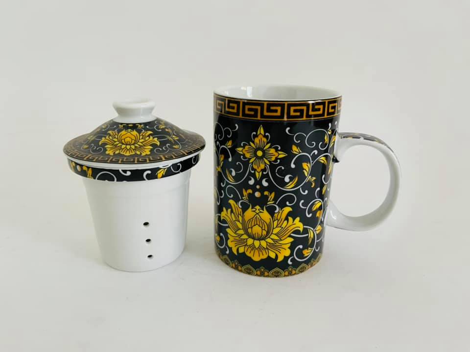 Taza de porcelana, con filtro y tapa.